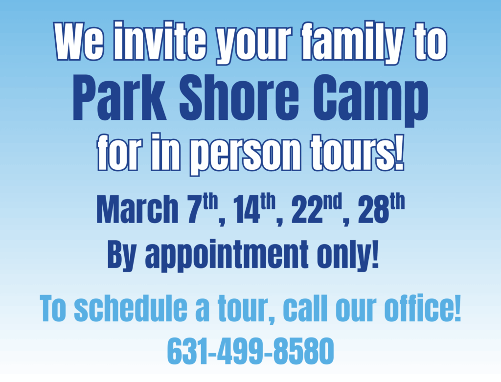 Schedule your camp tours to learn more about what Park Shore Camp has to offer! By appointment only. Call our office to schedule at 631-499-8580. Come see why families love Park Shore Camp!