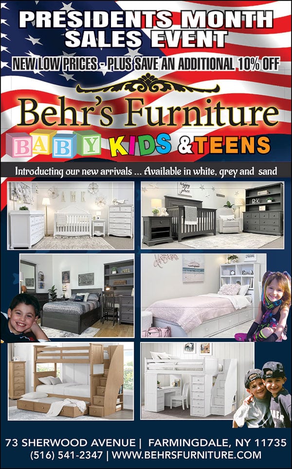 Behr’s Furniture Presidents Month Sales Event, New Low Prices Plus Save an Additional 10% OFF February 16, 2024 by Jennifer Keegan Behr’s Furniture Baby, Kids & Teens Learn More Now! Behr’s Furniture is conveniently located: 73 Sherwood Ave, Farmingdale, NY More Information: www.behrsfurniture.com 516.541.2347 Sponsored Advertising: Behr’s Furniture Updated February 13, 2026