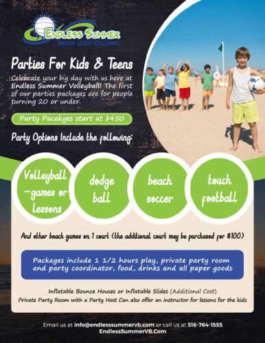 Volleyball Instructional lessons & parties for kids from 3rd grade through high school. Endless Summer is an amazing place to learn and progress in the sport of volleyball. Playing on the sand makes it fun and enjoyable for the younger ones to learn and the resistance of the sand strengthens growing athletes while providing a more forgiving surface versus hard court alternatives.