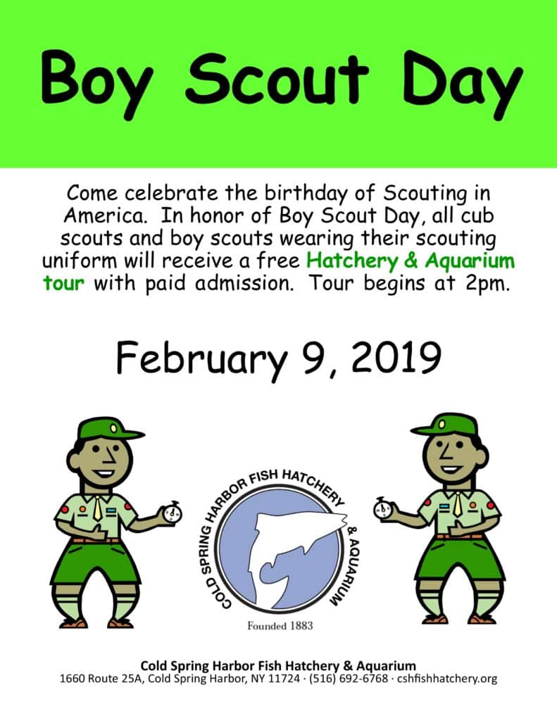 Come celebrate the birthday of Scouting in America. In honor of Boy Scout Day, all cub scouts and boy scouts wearing their scouting uniform will receive a free Hatchery & Aquarium tour with paid admission.
