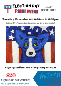 Election Day Paint event – Paint Blue Dog – Key to My Art East Rockaway – 11/6 – 11am – 12:30pm – $20 – age 5+ – Paint the “I voted” Blue Dog with step by step instruction! Drop off event! RSVP Required.