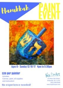 Hanukkah Paint Event Sunday, December 10th – 4pm – 5:30pm – Ages 6+ – $20 per painter includes canvas, paint, all supplies and instruction – Must RSVP. Event details:Start dateDecember 10, 2017 4:00 pmStart time4:00 pmEnd time5:30 pmLocationKey To My ArtLocation Address10 West Oak Street, AmityvilleGoogle Calendar iCal feed URL https://dev-yourlocalkids.com/?rhc_action=get_icalendar_events&ID=14159 Get Feed for iCal (Google Calendar). This is for subscribing to the events in the Calendar. Add this URL to either iCal (Mac) or Google Calendar, or any other calendar that supports iCal Feed. Download ICS file Venue DetailsVenueKey To My ArtAddress10 West Oak Street, AmityvilleCityAmityvillePostal code11701StateNYCountryUnited StatesInformationPhone631-608-9048Emailinfo@keytomyart.comGet directionsGet directions |||:: 10 West Oak Street, Amityville, NY 11701