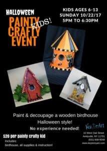 Kids Halloween Painty Crafty Event Sunday, October 22nd – 5pm – 6:30pm – Ages 6 -13 – $20 per painty craft includes birdhouse, all supplies & instruction. RSVP Required Event details:Start dateOctober 22, 2017 5:00 pmStart time5:00 pmEnd time6:30 pmLocationKey To My ArtLocation Address10 West Oak Street, AmityvilleGoogle Calendar iCal feed URL https://dev-yourlocalkids.com/?rhc_action=get_icalendar_events&ID=13615 Get Feed for iCal (Google Calendar). This is for subscribing to the events in the Calendar. Add this URL to either iCal (Mac) or Google Calendar, or any other calendar that supports iCal Feed. Download ICS file Venue DetailsVenueKey To My ArtAddress10 West Oak Street, AmityvilleCityAmityvillePostal code11701StateNYCountryUnited StatesInformationPhone631-608-9048Emailinfo@keytomyart.comGet directionsGet directions |||:: 10 West Oak Street, Amityville, NY 11701