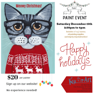 Cat Xmas Sweater – December 15th – 2:30pm – 4pm – Key to My Art – East Rockaway – $20 per painter includes 11″ x 14″ canvas, all painting supplies and step-by-step instruction. RSVP On the website www.keytomyart.com