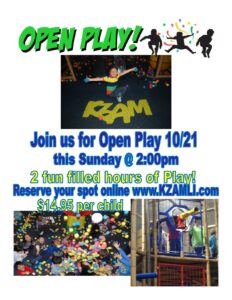 Sunday, October 21st, Open Play at 2pm – 2 fun filled hours for $14.95 per child – Reserve your spot online www.KZAMLI.com
