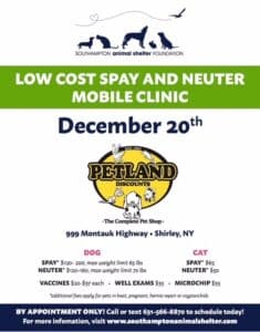 Low Cost Spay and Neuter Mobile Clinic Thursday, December 20th – Call or text 631.566.8870 for an appointment More Information: www.southamptonanimalshelter.com Event details:Start dateDecember 20, 2018Start timeEnd timeLocationGoogle Calendar iCal feed URL https://dev-yourlocalkids.com/?rhc_action=get_icalendar_events&ID=19094 Get Feed for iCal (Google Calendar). This is for subscribing to the events in the Calendar. Add this URL to either iCal (Mac) or Google Calendar, or any other calendar that supports iCal Feed. Download ICS file Venue DetailsVenueInformation