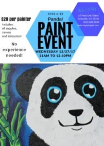 Panda Paint Event Wednesday, December 27th – 11am – 12:30pm – Kids Ages 6-13 – $20 per painter includes all supplies, canvas and instruction – Must RSVP. Event details:Start dateDecember 27, 2017 11:00 amStart time11:00 amEnd time12:30 pmLocationKey To My ArtLocation Address10 West Oak Street, AmityvilleGoogle Calendar iCal feed URL https://dev-yourlocalkids.com/?rhc_action=get_icalendar_events&ID=14161 Get Feed for iCal (Google Calendar). This is for subscribing to the events in the Calendar. Add this URL to either iCal (Mac) or Google Calendar, or any other calendar that supports iCal Feed. Download ICS file Venue DetailsVenueKey To My ArtAddress10 West Oak Street, AmityvilleCityAmityvillePostal code11701StateNYCountryUnited StatesInformationPhone631-608-9048Emailinfo@keytomyart.comGet directionsGet directions |||:: 10 West Oak Street, Amityville, NY 11701