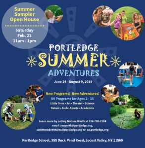 Portledge Summer Adventures Open House Saturday, February 23rd – 11am – 1pm – Summer Sampler Open House Event details:Start dateFebruary 23, 2019 11:00 amStart time11:00 amEnd time1:00 pmLocationPortledge SchoolLocation Address355 Duck Pond Road, Locust ValleyGoogle Calendar iCal feed URL https://dev-yourlocalkids.com/?rhc_action=get_icalendar_events&ID=20183 Get Feed for iCal (Google Calendar). This is for subscribing to the events in the Calendar. Add this URL to either iCal (Mac) or Google Calendar, or any other calendar that supports iCal Feed. Download ICS file Venue DetailsVenuePortledge SchoolAddress355 Duck Pond Road, Locust ValleyCityLocust ValleyPostal code11560StateNYInformationPhone516.750.3222Get directionsGet directions |||:: 355 Duck Pond Road, Locust Valley, NY 11560