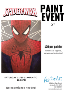 Spiderman Paint Event – Key to My Art Amityville – 11/10 – 11am – 12:30pm – $20 – age 5+ – Paint Spiderman with step by step instruction Drop off event! RSVP Required