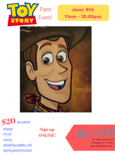Toy Story Paint Event – Woody June 8th – 11am – 12:30pm – $20 per painter includes 11″x 14″ canvas, all painting supplies and step by step instruction. RSVP Online. Event details:Start dateJune 8, 2019 11:00 amStart time11:00 amEnd time12:30 pmLocationKey To My ArtLocation Address10 West Oak Street, AmityvilleGoogle Calendar iCal feed URL https://dev-yourlocalkids.com/?rhc_action=get_icalendar_events&ID=20820 Get Feed for iCal (Google Calendar). This is for subscribing to the events in the Calendar. Add this URL to either iCal (Mac) or Google Calendar, or any other calendar that supports iCal Feed. Download ICS file Venue DetailsVenueKey To My ArtAddress10 West Oak Street, AmityvilleCityAmityvillePostal code11701StateNYCountryUnited StatesInformationPhone631-608-9048Emailinfo@keytomyart.comGet directionsGet directions |||:: 10 West Oak Street, Amityville, NY 11701