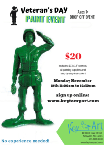 Veteran’s Day Paint Army Man – Key to My Art Amityville – 11/12 – 11am – 12:30pm – $20 – age 5+ – Paint Army Man with step by step instruction! Drop off event. RSVP Required.