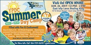 YPDC Summer Day Camp Open House January 26th – 12pm to 2pm – East Islip Lanes Bowling Alley, 117 E Main St, East Islip, NY – Info ypdc.com Event details:Start dateJanuary 26, 2019 12:00 pmStart time12:00 pmEnd time2:00 pmLocationYoung People's Day Camp - East Islip LanesLocation Address117 E Main StreetWebsiteypdc.com/suffolk-county-day-camp/Google Calendar iCal feed URL https://dev-yourlocalkids.com/?rhc_action=get_icalendar_events&ID=19740 Get Feed for iCal (Google Calendar). This is for subscribing to the events in the Calendar. Add this URL to either iCal (Mac) or Google Calendar, or any other calendar that supports iCal Feed. Download ICS file Venue DetailsVenueYoung People's Day Camp - East Islip LanesAddress117 E Main StreetCityEast IslipPostal code11730StateNYInformationPhone631.476.3330EmailMichael@ypdc.comWebsiteypdc.com/suffolk-county-day-camp/Get directionsGet directions |||:: 117 E Main St, East Islip, NY 11730