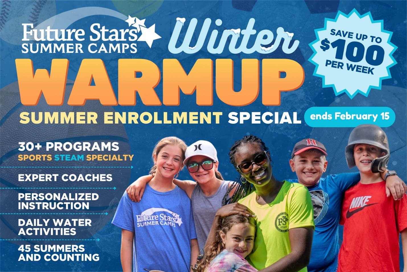 Winter may be in full swing, but Future Stars is already warming up for summer camp season! And that means special early enrollment savings for families who plan ahead. With 30+ Sports, STEAM, and Specialty programs to choose from, campers age 4-16 can focus on what they love or discover something new. Register now to secure your spot in your favorite program and stack exclusive Winter Warmup savings before they’re gone: