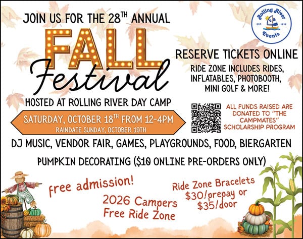 Break out your best Halloween costume and bring your family to the 28th Annual Rolling River Fall Festival on Saturday, October 18. The festival runs from 12:00-4:00pm and guests may attend at any time. The Fall Festival serves as our largest fundraiser of the year for the Rolling River Campmates Scholarship Program, which provides funds to send local children to camp who are in need of financial assistance.